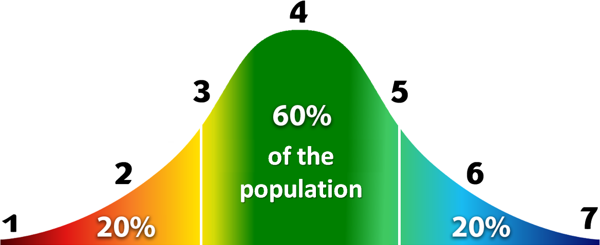 Это означает, что большинство населения наберет 3, 4 или 5 баллов, и только небольшая часть получит 7 или 1 балл.