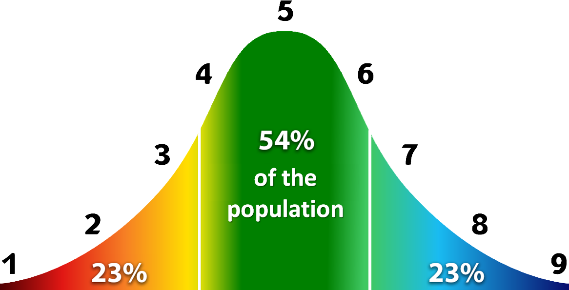 Это означает, что большинство населения получит 4, 5 или 6 баллов и только небольшая часть получит 9 или 1 балл.